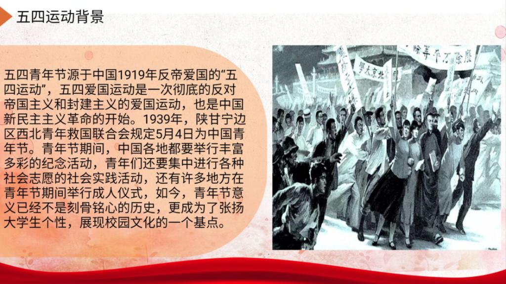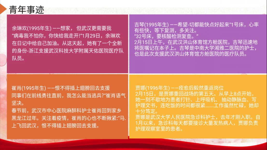 活动由团支书杨泺霖主持,在活动开始之前本班23个同学分别用自己的家乡方言将本次活动主题“五四青年、放飞梦想”说出,全场气氛顿时活跃起来。随后团支书带领大家通过观影的方式回顾五四历史知识。辅导员黄晔老师引用习近平总书记的话:青春由磨砺而出彩,人生因奋斗而升华。号召班级同学面对艰难困苦要有担当、有奉献精神,为班级谭依芸等同学在疫情期间争做防疫志愿者点赞,希望同学们继续传承五四精神,凝聚青春力量,践行时代赋予的责任和使命。随后武茶等同学分享的几个关于抗疫无名英雄的小故事瞬间感动全场,催人泪下。之后,所有同学打开人民网微信公众号,郑重的在H5小程序中将自己的五四梦想放飞。