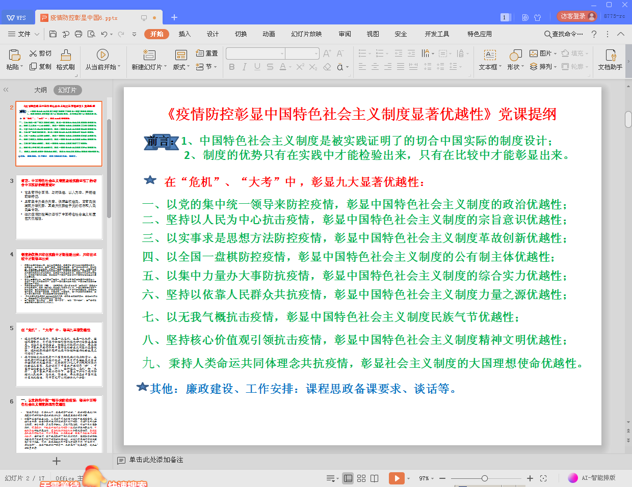 这次新冠肺炎疫情,既是一次“危机”,也是一次“大考”。党课紧贴当前疫情防控和复工复产工作,从以党的集中统一领导防控疫情,彰显中国特色社会主义制度的政治优越性;以人民为中心抗击疫情,彰显中国特色社会主义制度的宗旨意识优越性;以实事求是思想方法防控疫情,彰显中国特色社会主义制度革故创新优越性;以全国一盘棋防控疫情,彰显中国特色社会主义制度的公有制主体优越性;以集中力量办大事防抗疫情,彰显中国特色社会主义制度的综合实力优越性;坚持以依靠人民群众共抗疫情,彰显中国特色社会主义制度力量之源优越性;以无我气概抗击疫情,彰显中国特色社会主义制度民族精神优越性;坚持核心价值观引领抗击疫情,彰显社会主义制度精神文明优越性;秉持人类命运共同体理念共抗疫情,彰显社会主义制度的大国理想使命优越性九个维度阐述疫情防控彰显中国特色社会主义制度显著优越性。