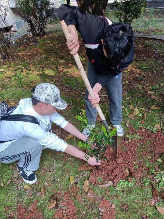 活动开始,大家都争先恐后撸起袖子,埋头挖土栽种树苗。大家认真学习,彼此合作完成树苗的栽种,体会到照顾树苗的不易和亲自栽种树苗的快乐。现场气氛热烈,同学们还给自己种的树命名,面向自己种下的树苗许下心愿。活动结束后,参与活动全体人员合影留恋。