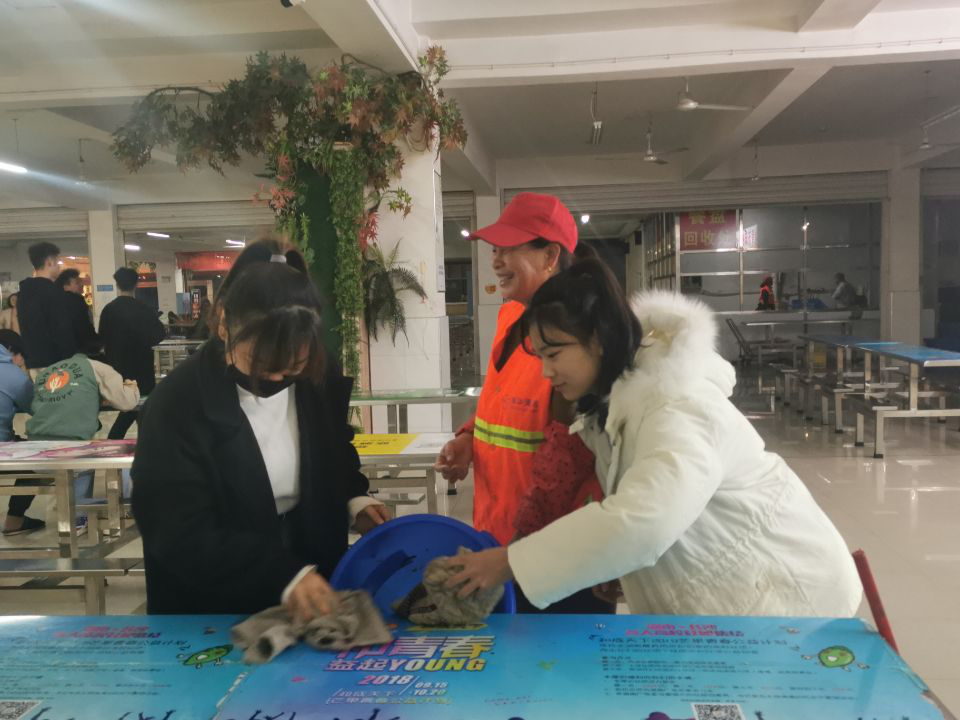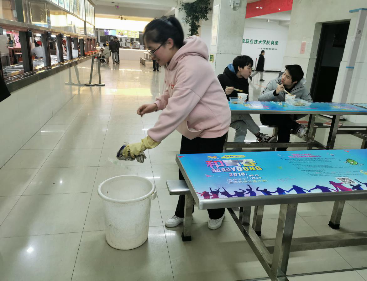 在班委组织下,学员们积极行动起来,有的帮助卫生阿姨扫地面,有的为员工收集用餐后碗筷、擦餐桌,有的维持打饭秩序,有的宣讲节约用餐,光盘行动……