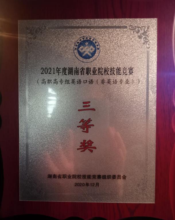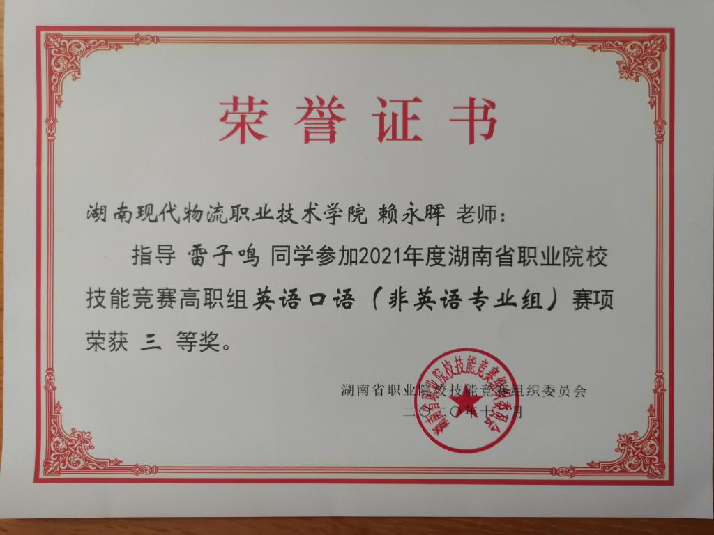 经过激烈角逐,由赖永晖老师指导的雷子鸣同学荣获湖南省非英语专业组三等奖。雷子鸣同学每日刻苦加练,勇于面对挑战。集训效果显著,最终在本次大赛中取得了良好成绩。