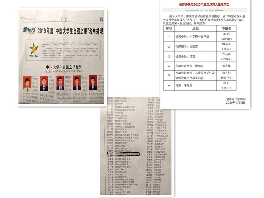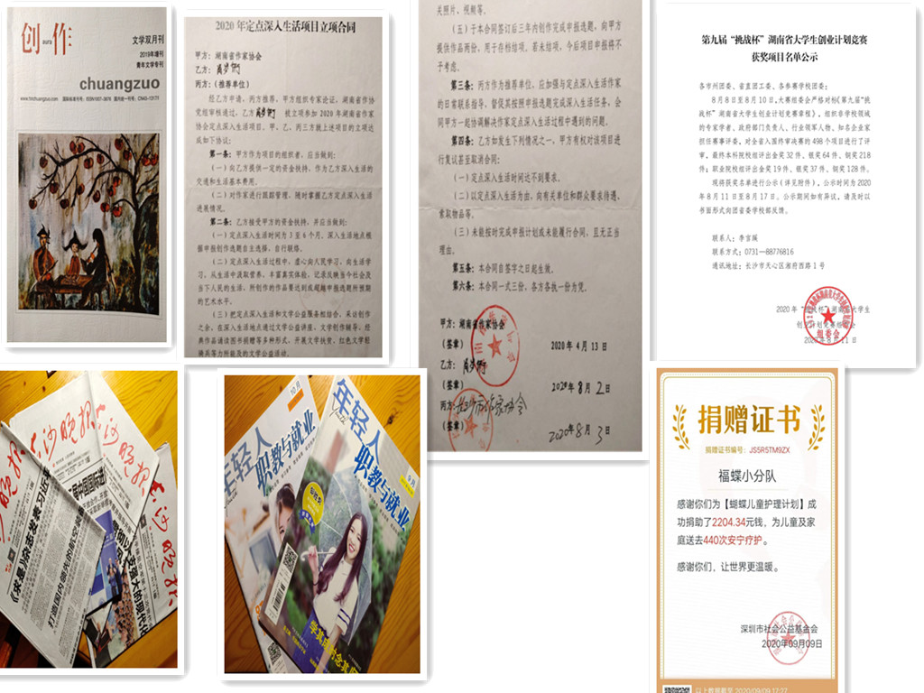 2020年,湖南省作家协会在年初举行本年度定点深入生活项目申报选题评审会后,经过专家审读和充分讨论,于4月15日最终确定6部作品选题为省作协2020年度定点深入生活项目。在众多90后、80后甚至70后前辈作家申报的众多选题中,我校肖岑衎同学的长篇非虚构纪实文学《生死两相安》选题榜上有名,除获得10000元创作资金外,更是于8月5日正式订立立项合同。《生死两相安》凭借新颖的纪实素材和富有人文关怀的特色获得了湖南省作家协会的立项支持,以“特殊群体与疾病甚至死亡狭路相逢”的生活为切入口,全面、深入、生动、丰富地反映中国共产党成立100周年以来对儿童民政福利事业的发展。据悉这部规划二十余万字、预期三年完成的作品,在出版后将是我国第一部系统地以儿童临终关怀为题材的非虚构纪实作品,将填补长篇非虚构纪实作品在这一题材的空白。